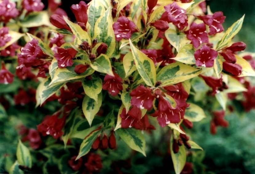 - Вейгела Виктория (Weigela florida Victoria). Высота куста около 100 сантиметров. Листва коричневато-красная, а цветки имеют багряный окрас.