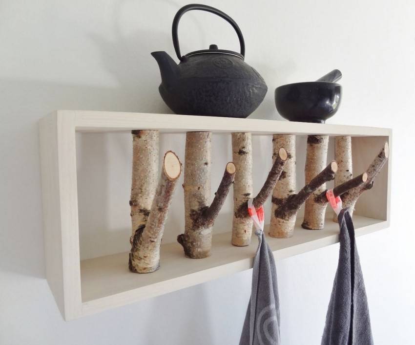 Так само, они могут изготавливаться самостоятельно и покупаться в магазине. Если вы хотите изготовить вешалку, только полагаясь на собственные силы и подручные материалы, то можете для крючков использовать сухие толстые ветки или же черенки для швабр и лопат. Вам нужно будет выбранный материал поделить на нужное количество частей, придать крючкам необходимую форму и отшлифовать их, далее их нужно буде вскрыть лаком.