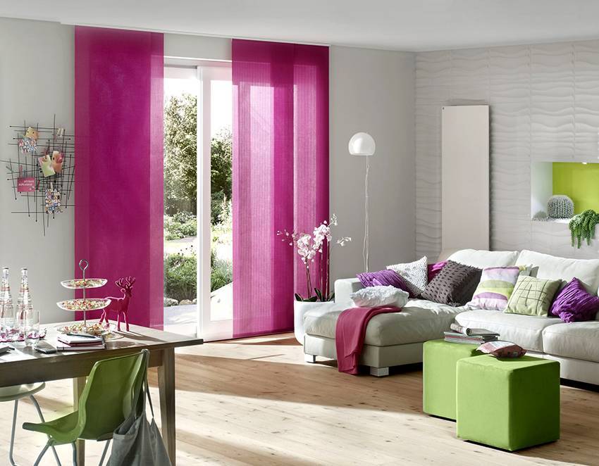Рассматривая вопрос, какие бывают карнизы, нельзя не вспомнить особый тип конструкции, предназначенной для японских штор. Данная модель состоит из нескольких направляющих (от 2 до 5), каждая из которых предназначена для одного или двух натянутых по длине полотен. Такие шторы не собираются в складки. Отдельные полотна можно раздвинуть в разные стороны, поменять местами или расположить друг за другом, как показано на фото трехрядного потолочного карниза для японских штор.