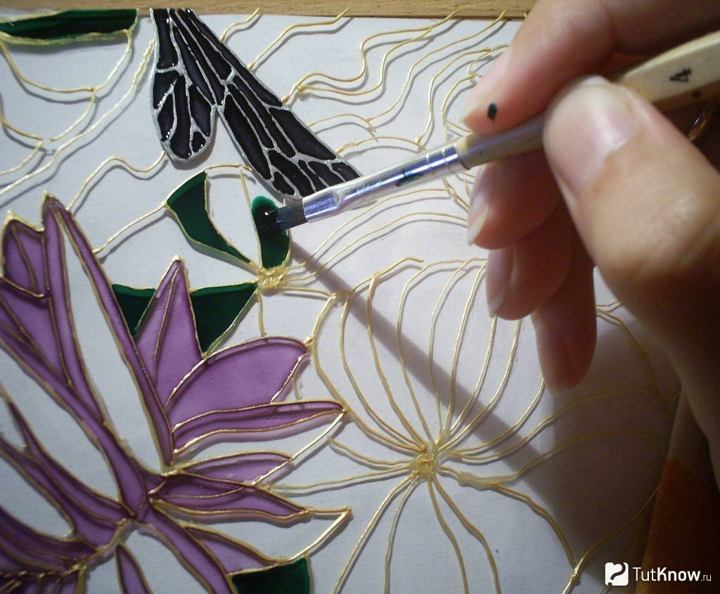 - Нарисованный витраж. Приготовьте такие материалы: эскиз витража в полный размер, стекло для нанесения витража, специальные краски и растворитель, трафарет, маркеры, палитра, синтетические кисточки, ватные диски и ватные палочки, иголка для прокалывания пузырьков на краске. Подобранные стекла подходящей формы нужно тщательно промыть и обезжирить. На эскиз витража уложите стекло и переведите маркером изображение. Далее следует дождаться полного высыхания маркера, затем нанести краску на один фрагмент. Первый слой делать мазками не рекомендуется, лучше капнуть внутрь фрагмента и распределить раствор кисточкой до контуров. Таким же образом заполните краской остальные фрагменты. Второй слой раствора можно наносить только после полного высыхания первого.