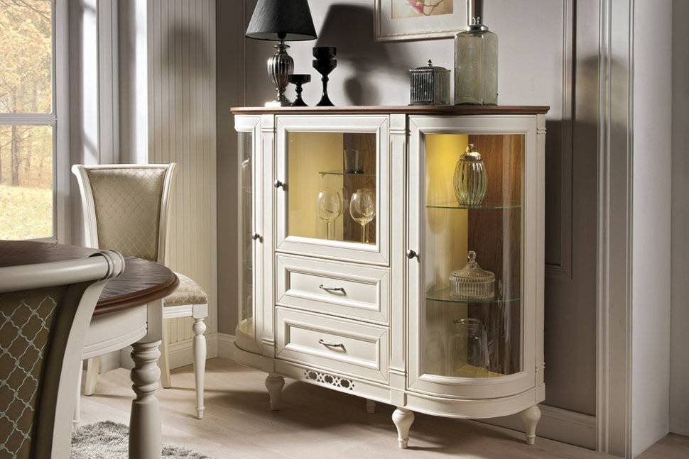 Если сервант приобретается для роскошной большой гостиной, то рекомендуется выбирать массивные белые экземпляры.
