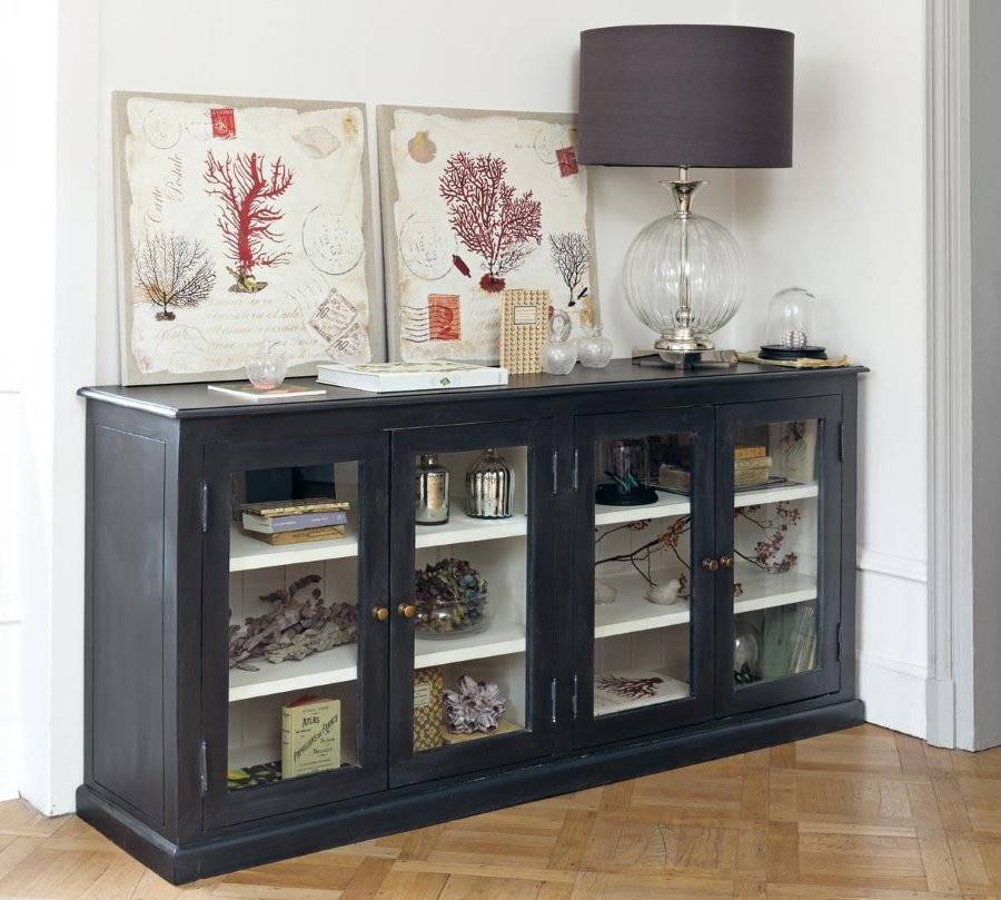 Низкая тумба-витрина может стать отличным решением, если не хочется загромождать пространство большим шкафом. Такой комод также может совмещать в себе и стеклянные, и закрытые отсеки. На тумбу можно ставить вазы с цветами, фото в рамках и прочий декор. Место над мебелью остается свободным, что позволяет повесить на стену картину, зеркало или светильник.