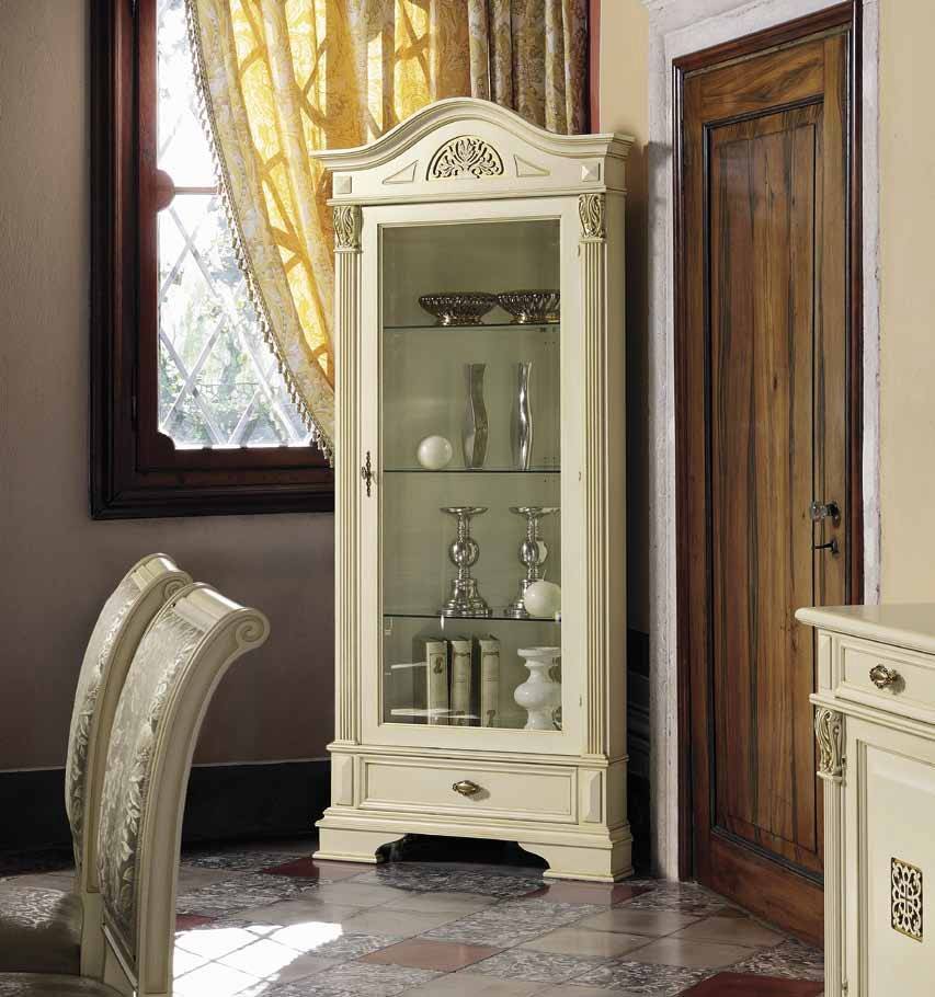 Большинство стеклянных витрин – напольного типа, но встречаются навесные. Напольные – самые устойчивые модели, на сплошном основании или изящных фигурных ножках, их можно до предела нагружать тяжелой посудой. Фурнитура – массивная золоченая.