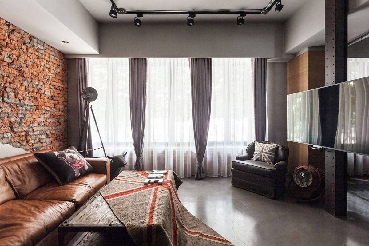 Дизайн штор для гостиной в стиле лофт не допускает использования ярких оттенков, драпировок, рюшей, бахромы и других декоративных элементов.