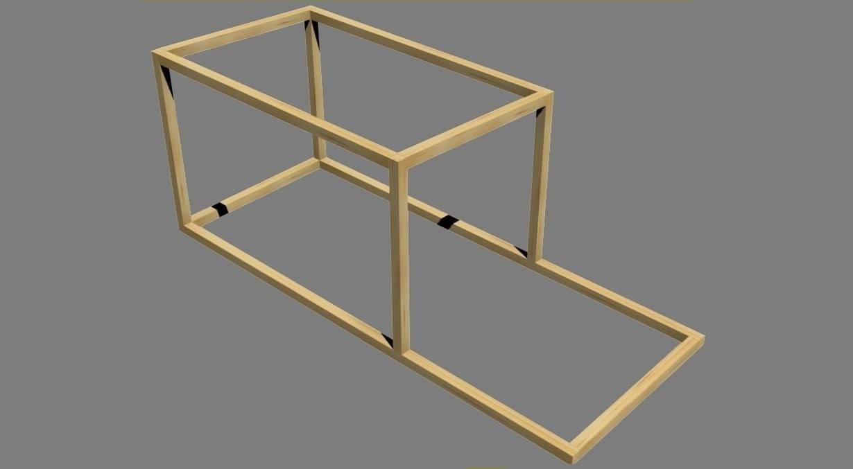 Четыре бруска формируют раму днища. В углах вертикально крепятся стойки. Размер стоек соответствует высоте будки. Сверху они так же обвязываются брусками. Каркас будет прочным, если на дно и по бокам лаза закрепить дополнительные перемычки.