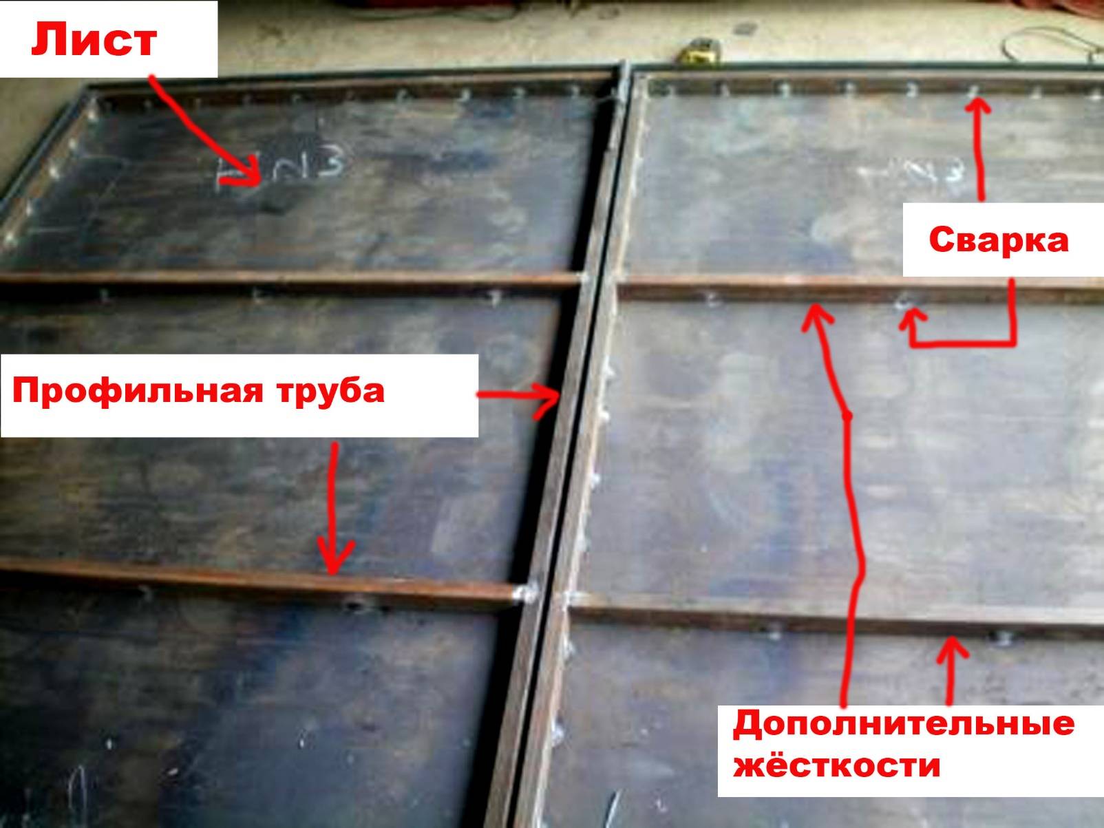 Если ворота большие, то для их прочности устанавливаются ребра жесткости. Достаточно приварить внутри каждой створки 1–3 металлические планки меньшего сечения. Благодаря этому при ударе или других нагрузках, конструкция не будет так деформироваться.
