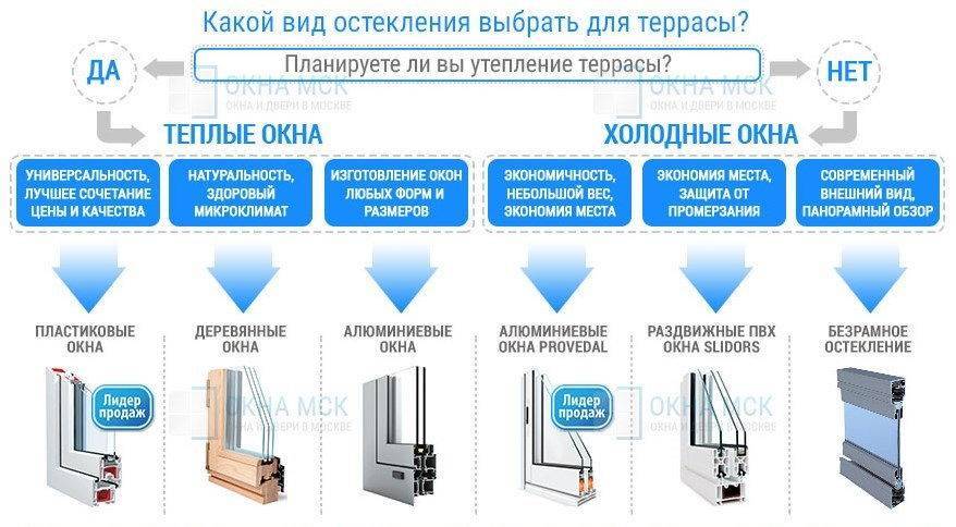 Разобраться со всеми типами остекления нам помогла компания «Окна и двери МСК». Так, нам рассказали, что остекление придомовых построек может быть холодного и теплого типа. Первый вариант выбирают для беседок и террас, которые не планируется использовать зимой, т.е. остекление носит только защитную функцию. Второй вариант позволяет использовать террасу в качестве полноценно функционального, отапливаемого помещения (используются пластиковые или деревянные окна). Разобраться с тем или иным типом оконных систем и выбрать оптимальный Вам поможет следующая схема, которую любезно предоставили нам специалисты компании:
