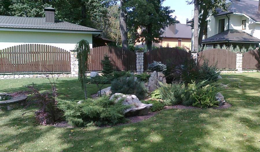 Японский стиль тоже подойдет. Он предполагает наличие небольшого искусственного водоема, декоративных, природных оригинальных камней, фонариков во дворе. Из растений предпочтение отдается можжевельнику, карликовым соснам. Аккуратность, сдержанность – характерны для японского сада.