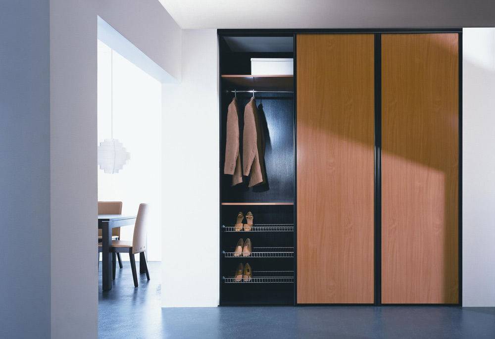 Встроенное изделие станет прекрасным решением благоустройства небольшой прихожей . Благодаря роликовому механизму раздвижных дверей, экономится немало места, которого всегда не хватает при распашной дверной конструкции шкафа.