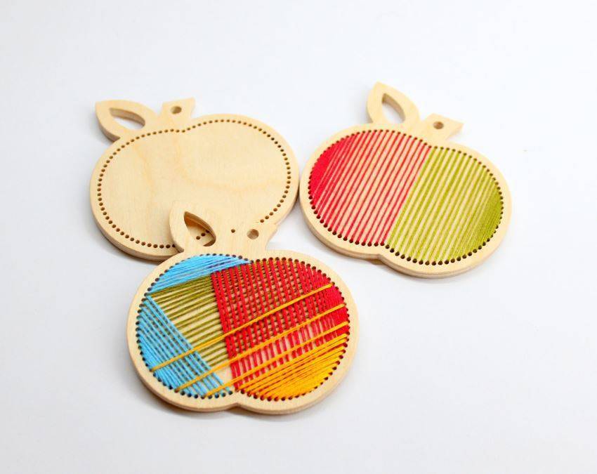 Вы почувствуете акцент скандинавского стиля в комплекте деревянных яблок, которые также станут замечательным подарком для ваших друзей! Березовая фанера была использована в качестве натурального фона для красочного и современного орнамента.