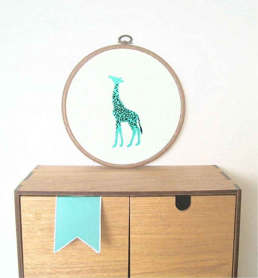 Эта восхитительная вышивка жирафа декорирована узором ручной работы. Сочетание цвета морской волны с тёмной нитью создаёт яркий текстурный эффект, замечательно гармонирующий с белоснежным фоном!