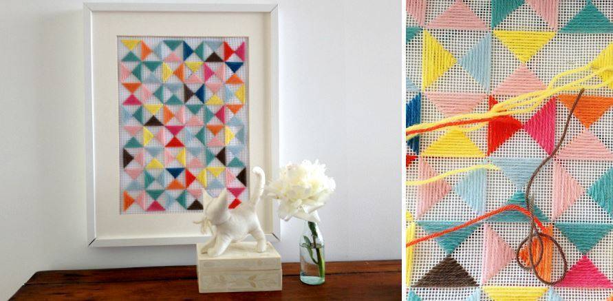 Вышитый орнамент на сетке – это великолепная творческая продукция от She Makes a Home . Насыщенные краски и обилие треугольников принесут в домашний декор особое очарование и магнетизм. К тому же это бюджетный вариант украшения апартаментов!