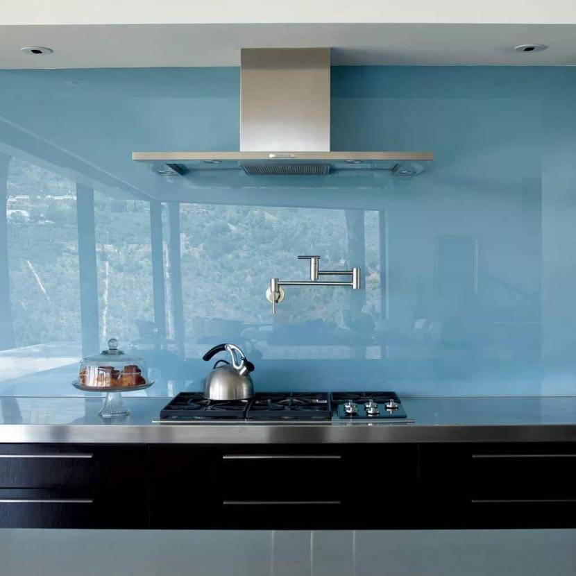 - Стекло. Украшенное узорами матированное или прозрачное закаленное стекло очень просто мыть, оно не поддается механическим, химическим и температурным воздействиям. Стеклянные поверхности в длину могут достигать 3-х метров, что позволяет создавать фартуки без швов и стыков.