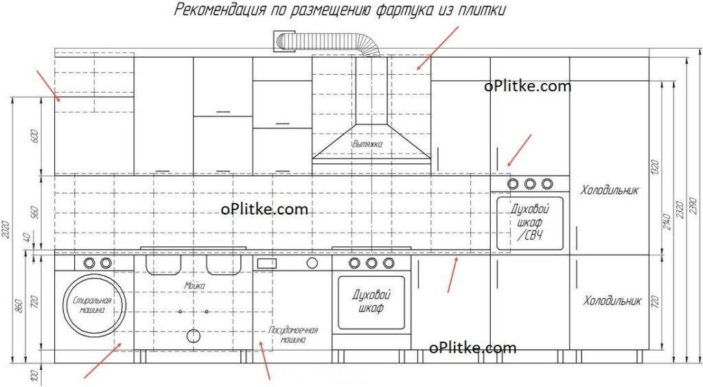 Соответственно, ширина фартука будет равна разности между высотой напольного шкафа и границей навесного. Например: высота напольных шкафов составляет 80 см, нижняя граница навесного шкафа – 135 см, соответственно, ширина отделки на стене будет равна 135-80+2=57 см.