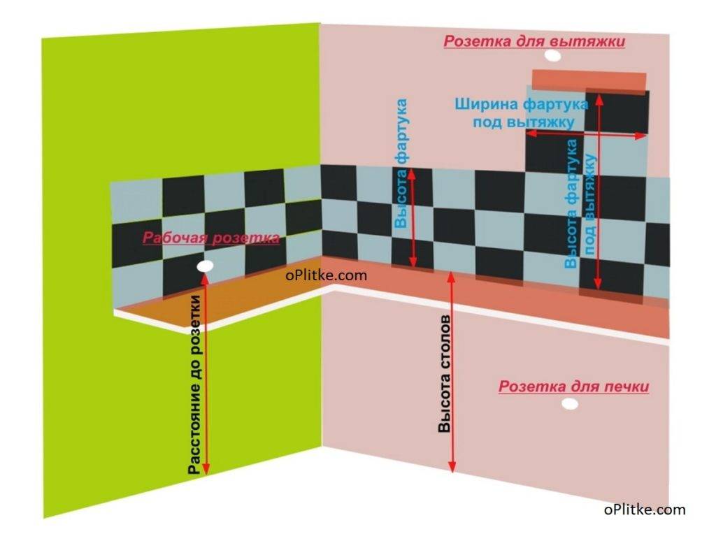 Размер фартука рассчитывается индивидуально для каждой кухни. Высота фартука — это уровень от пола на котором он монтируется. На это могут влиять следующие факторы: