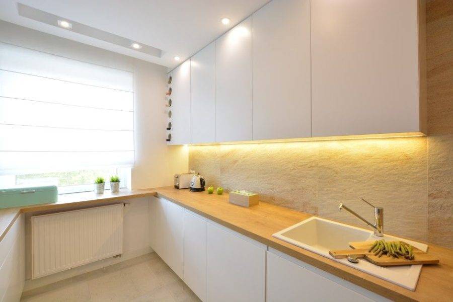 Без фартука не обойтись в тесных кухнях, потому что сплошная стенка забирает много пространства, и на разделочную поверхность его почти не останется. Зачастую предметы на верхних полках находятся на неудобном расстоянии, но над нижними ящиками запас приходится делать исходя из обязательных норм. Перечисленные нюансы означают безальтернативность двухъярусной мебели в маленькой кухне.