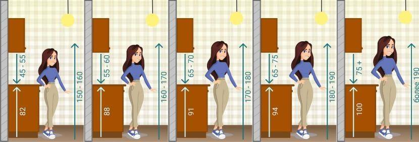 - расстояние от пола до столешницы выбирают с учетом роста хозяйки кухни.