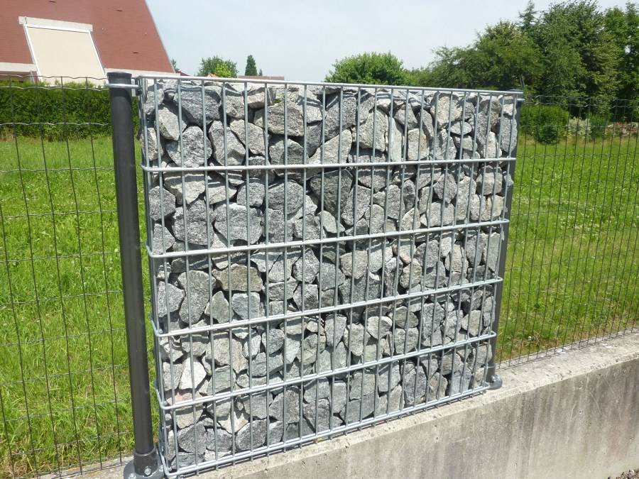 Одного полюса достаточно для поддержки габиона максимальной длиной 1,5 м. Если конструкция длиннее, в ней должно быть больше полюсов. Колонна вмонтирована в фундамент фундамента, выполненного до глубины грунтовых морозов. Есть также посты со специальной базой для крепления к плинтусам.