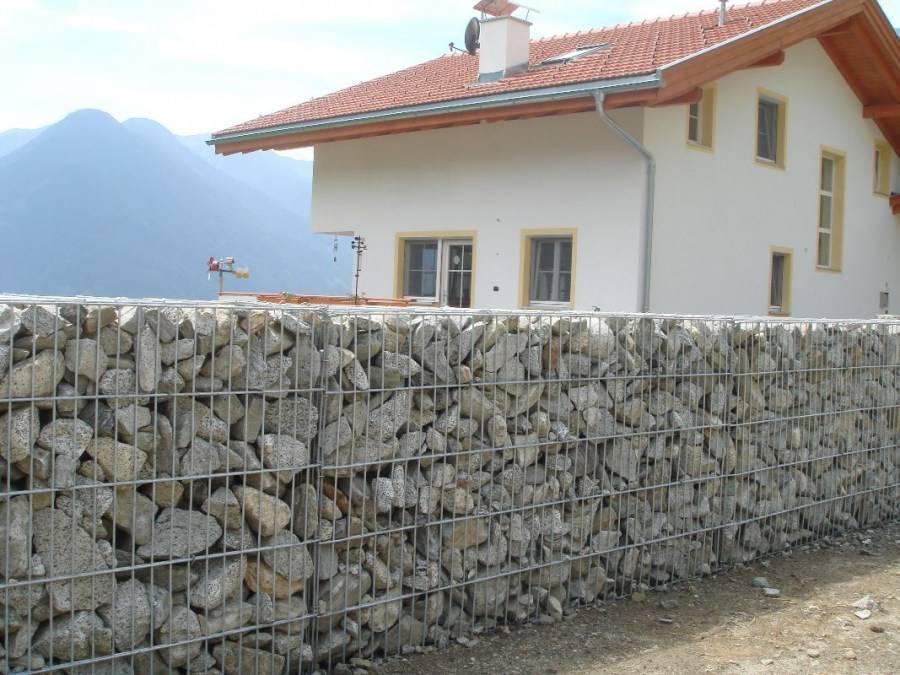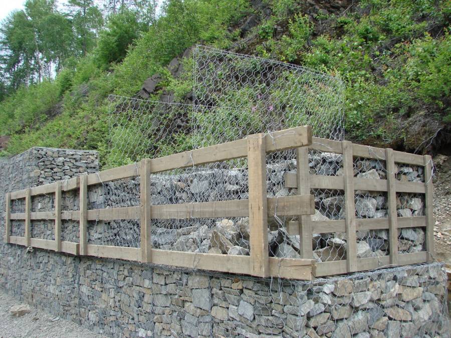 Гораздо тяжелей монтировать большие контейнеры – для подпорных стен или высоких ограждений. В этом случае сначала ставят и бетонируют стабилизирующие столбики, на которых затем укрепляется сетка.