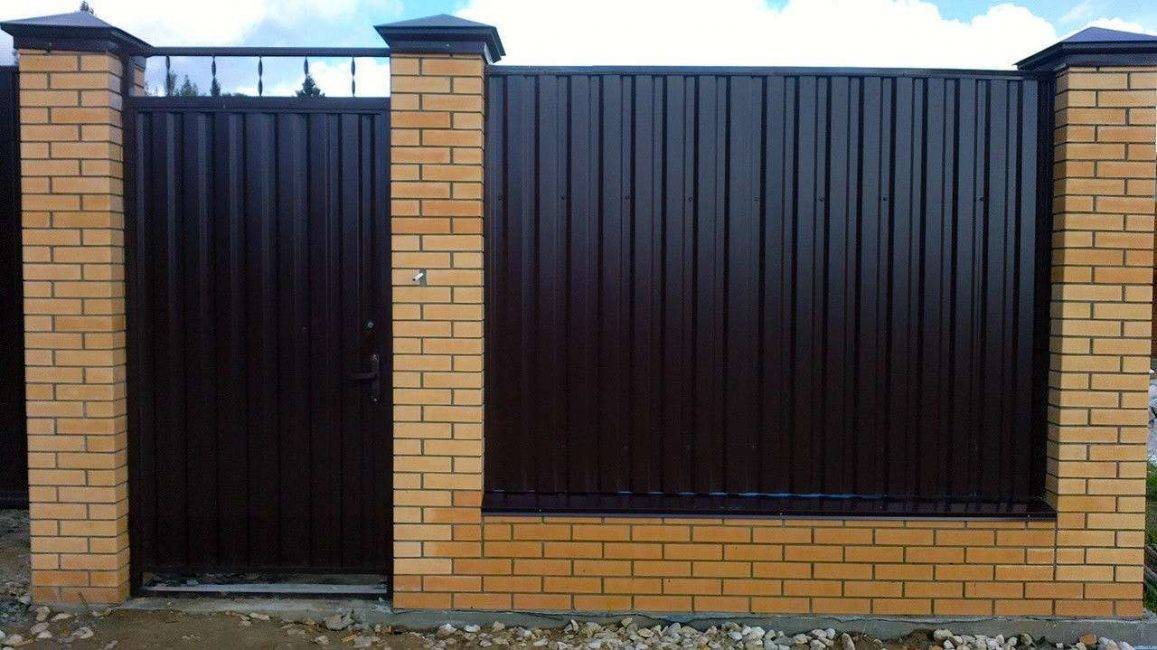 Сочетание желтого кирпича и темно-коричневого профнастила – один из самых распространенных вариантовИсточник mebelsobe.ru