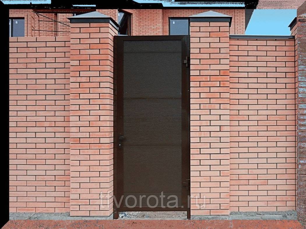 Такое ограждение получило широкое распространение, благодаря своему благородному внешнему виду. Между колоннами из кирпича располагаются секции из профнастила, который крепится на лаги из профильной трубы или уголок. Если пролеты между опорными столбами достаточно большие, появляется необходимость в монтаже дополнительных лаг, которые устанавливаются с тыльной стороны.