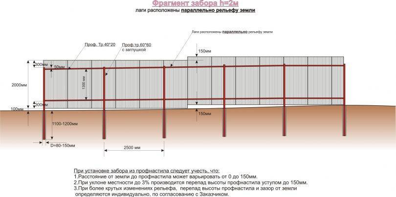 Мастера советуют при высоте забора до 2 000 мм использовать 2 лаги. Причем их расстояние от краев профнастила составляет 300 мм.