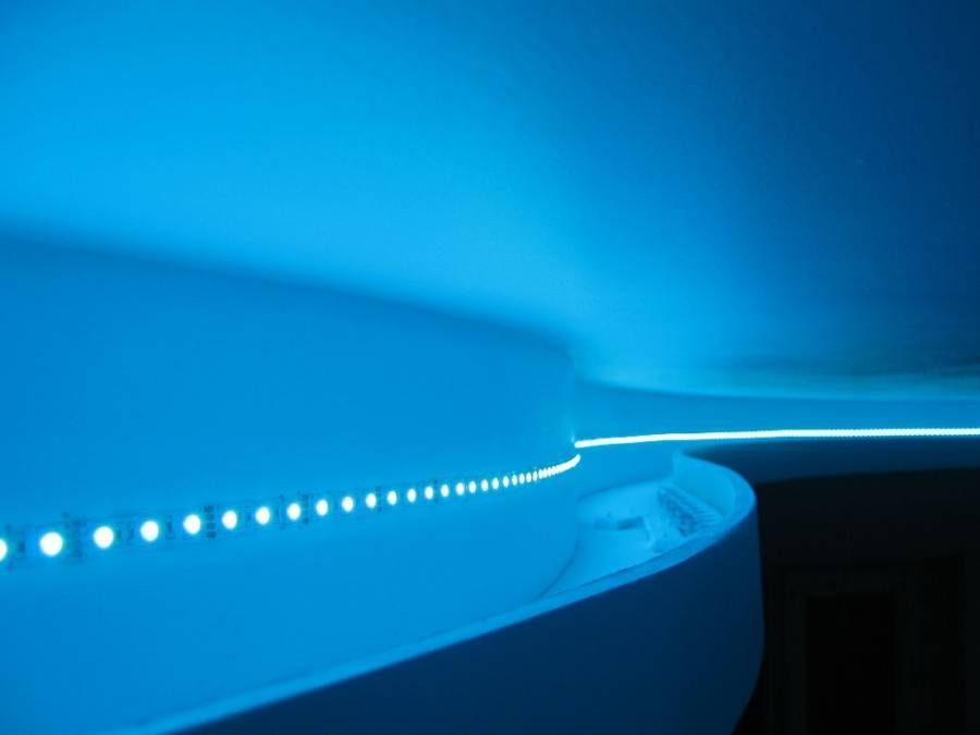 Это наиболее грамотное решение при создании скрытой подсветки потолка. Светодиодную ленту необходимо помещать ближе к краю карниза, благодаря чему распространение светового потока будет равномерным и степень освещённости потолка повысится.