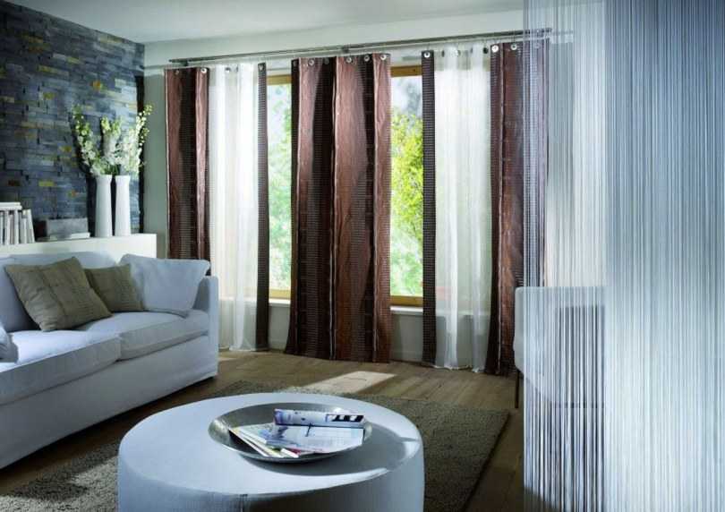Нитяные занавески не нуждаются в стирке и глажке, просты в обслуживании и навесе и могут быть выполнены в любом цвете. Их называют также “лапша”, “веревочные” или “бусы”. Такими шторами можно украсить не только оконный, но и дверной проем.