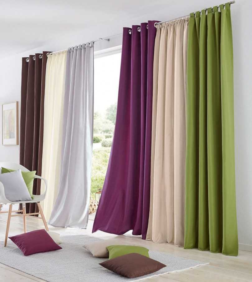 Можно использовать сразу несколько оттенков для изготовления изделия. Комбинированные шторы оживляют монотонный интерьер, выглядят очень стильно. Повторяющийся узор и оттенок штор на кухонном фартуке, скатерти, чехлах для стульев, небольших подушечках на диване ‒ придаст гармонии комнате.