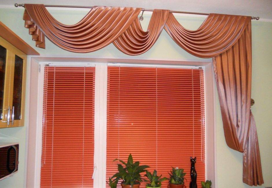 Практичность жалюзи позволяет их применять не только в жилых комнатах, но и на кухне. Они создают хорошую защиту от солнца, что делает их незаменимыми помощниками на южных окнах. Арочные ламбрекены в этом случае составят прекрасное сочетание с жалюзи.