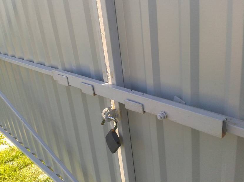 Принцип конструкции похож на засов вертушку, только запирающаяся металлическая полоса фиксируется не в отдельно приваренные неширокие пазы, а в швеллер, который приварен по всей ширине второй створки ворот.