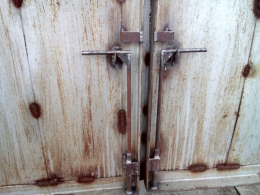 Посередине поворачивающейся запорной трубки с крюками надо приварить кусок трубы 30 см – это будет ручка для удобного поворота засова. Принцип такого запора можно посмотреть и в фурах – крепит надежно и герметично.