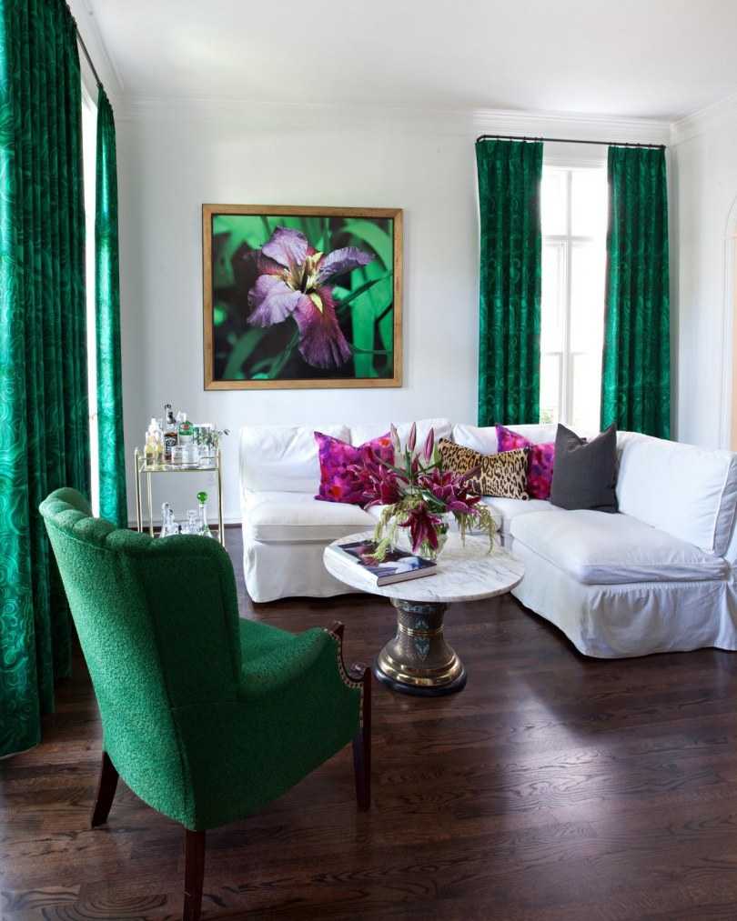 Излишне темный нефритовый и изумрудный оттенки создают тяжелую атмосферу, их можно использовать только в достаточно светлых помещениях. Шторы для них выбирают ярких, насыщенных оттенков красного, малинового, вишневого.