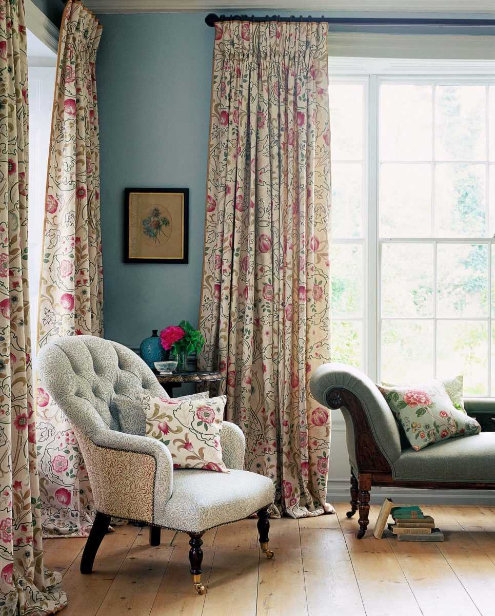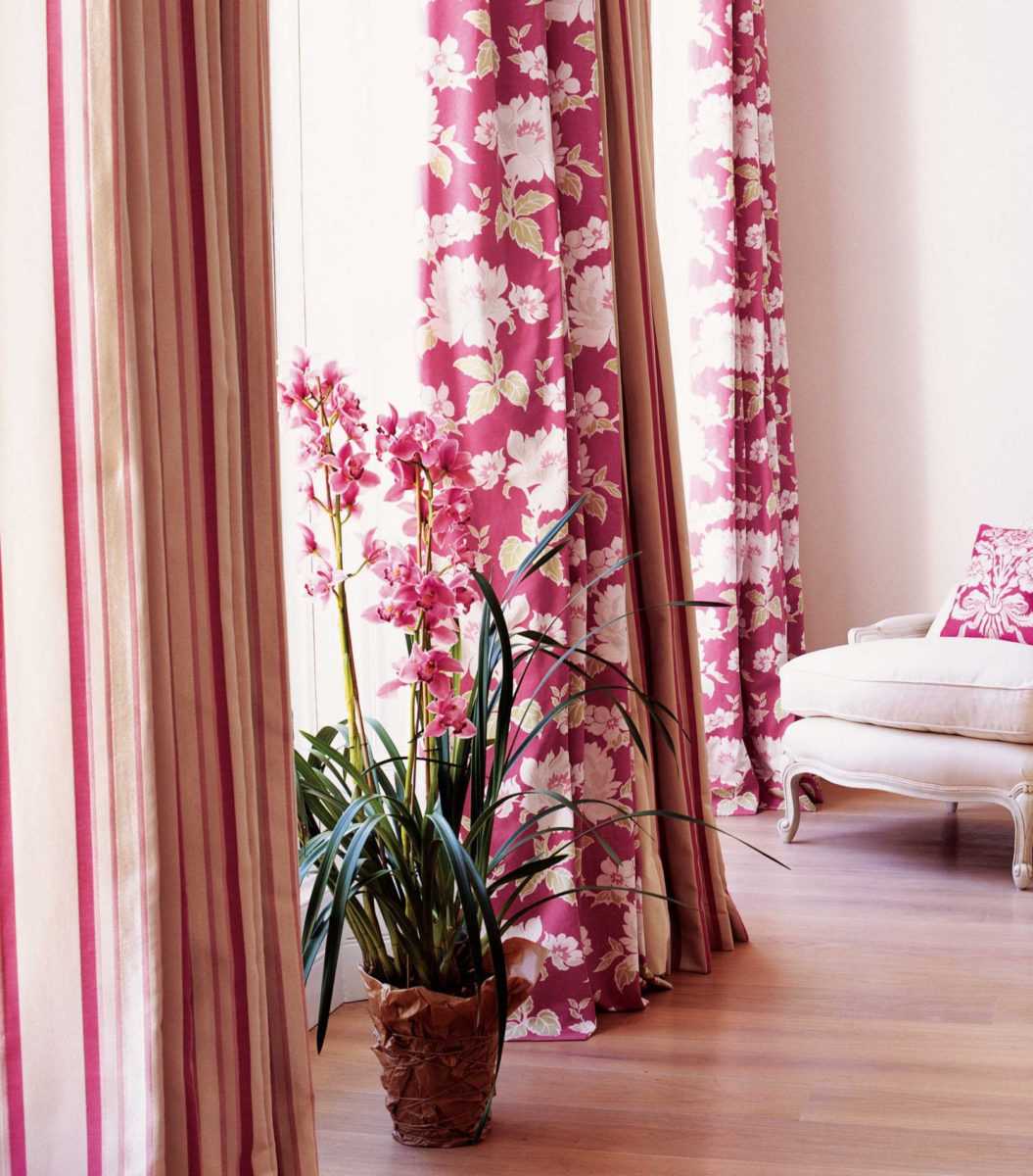 Если используется тюль или портьеры с довольно крупным цветочным узором, то это оптимальный вариант для просторных комнат. Особенно красиво такие шторы будут выглядеть в помещении с высокими потолками и оконными проемами, имеющие нестандартную форму.