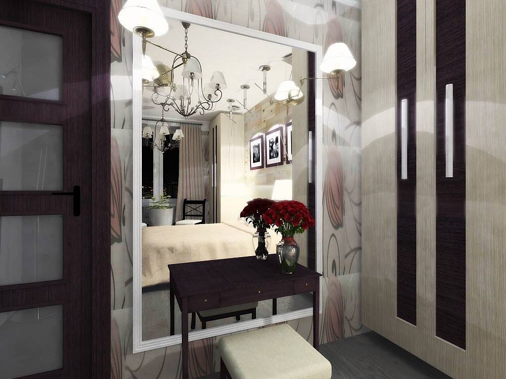 Большое зеркало, вмонтированное в дверцу шкафа, способствует зрительному расширению пространства