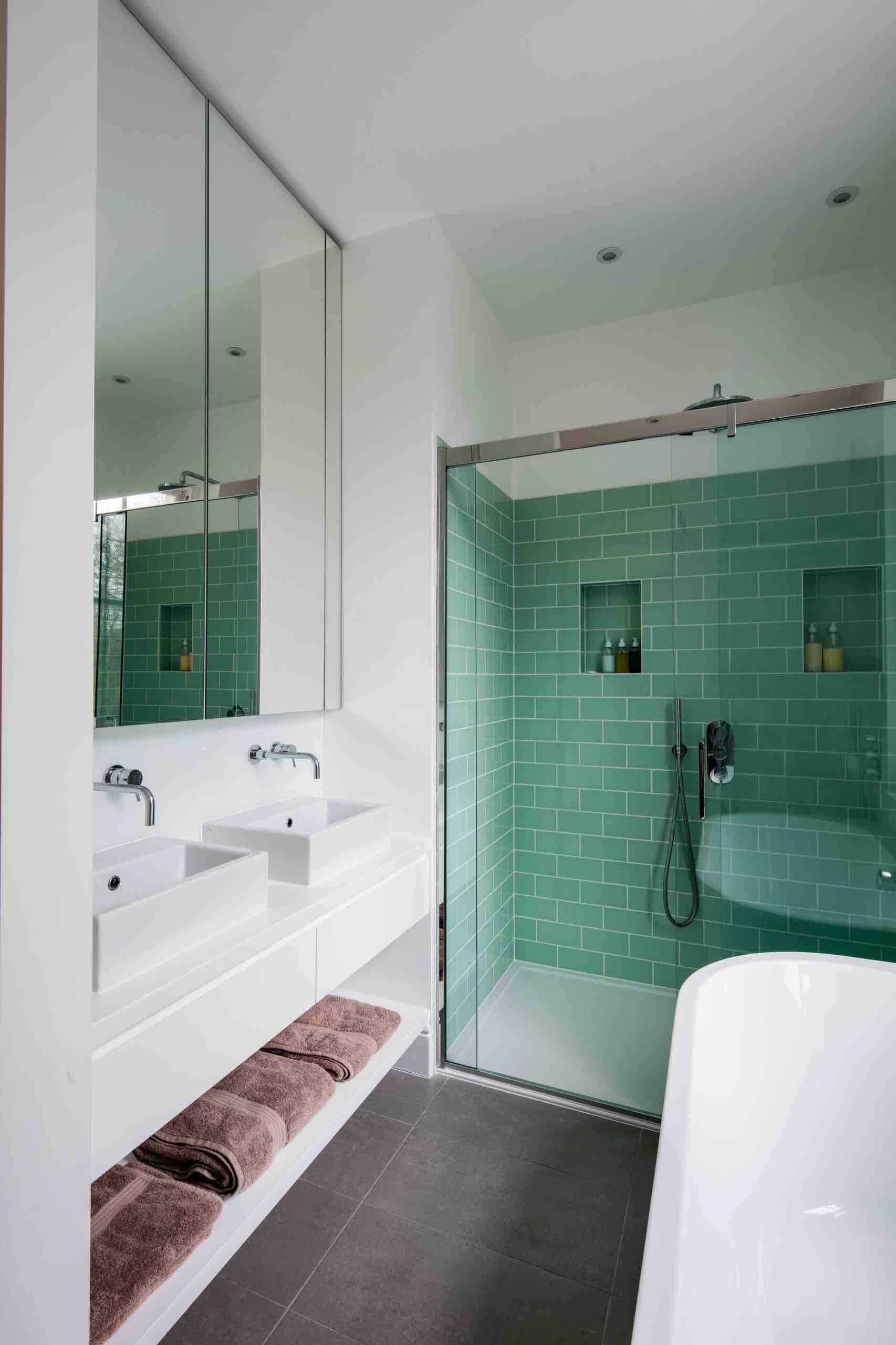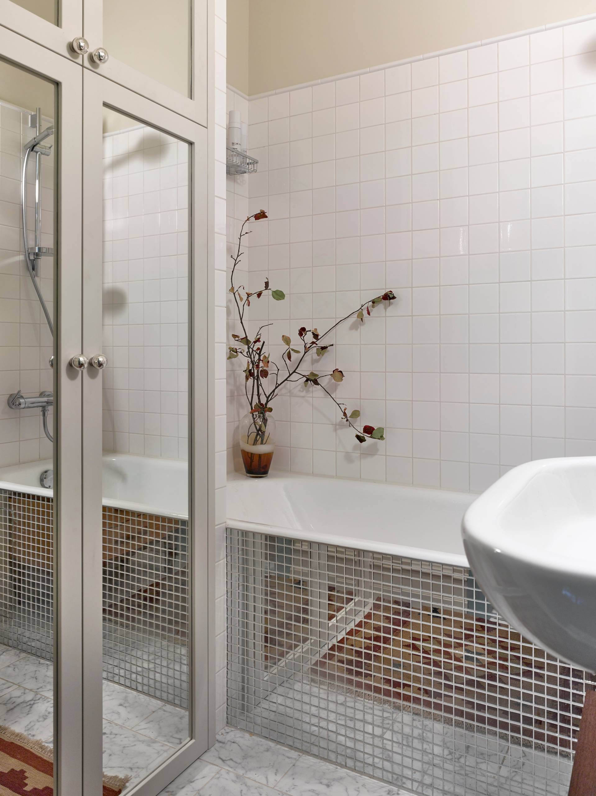В типовых квартирах стену над длинной стороной ванны оставляют пустой: она зачастую служит душевой, и человеку, стоящему под струями воды, ничего не должно мешать. Удачное место для хранения – противоположная от душа стена.