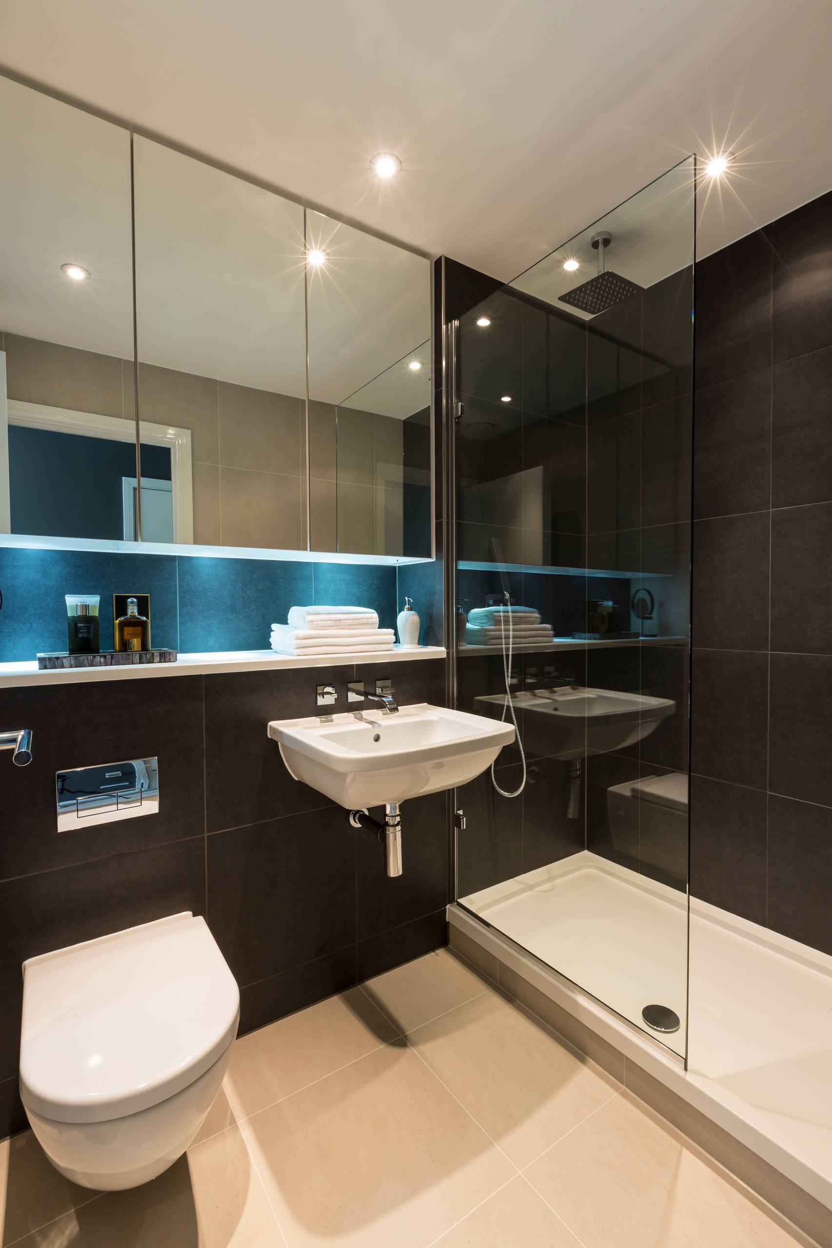 Самые яркие источники освещения на зеркале используются над умывальником, а в зоне душевой и других комнатах используется более приглушённый свет зеркал.