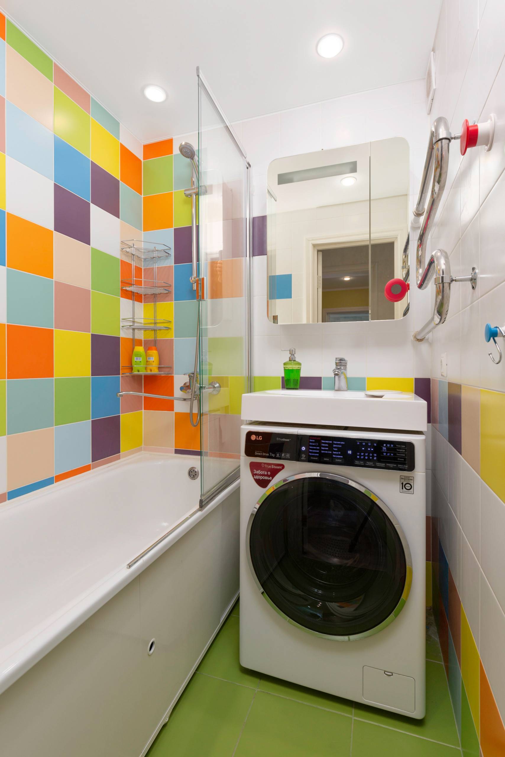 Если стиральная машина расположена в ванной комнате, стоит защитить ее поверхность, а заодно воспользоваться дополнительным местом хранения вещей.