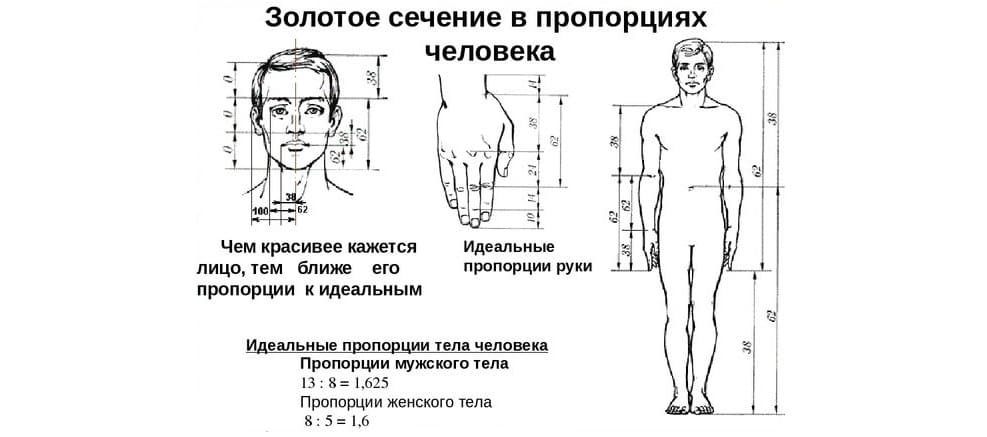 Все, абсолютно все пропорционально: кости, наши пальцы, ладони, расстояния на лице, расстояние вытянутых рук по отношению к телу и так далее. Но даже это не все, внутреннее строение нашего организма, даже оно, приравнивается или почти приравнивается к золотой формуле сечения. Вот какие расстояния и пропорции: