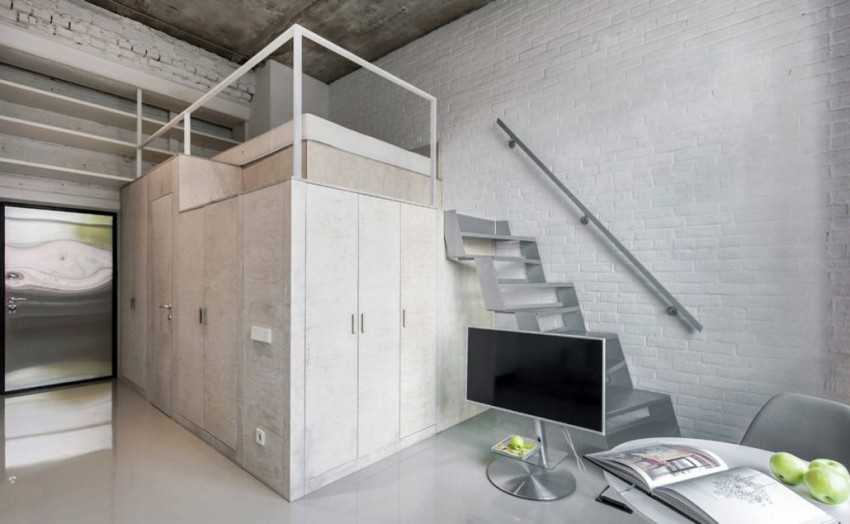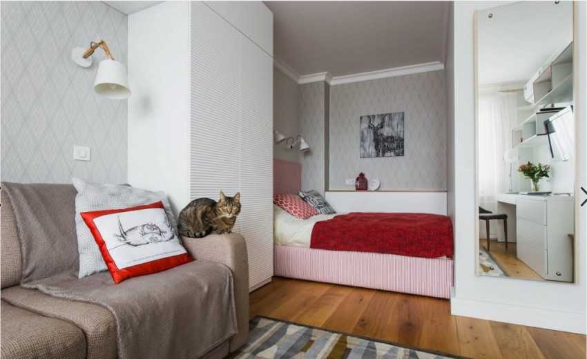 Если предложенный вариант не устраивает, то кровать располагается в специально отгороженной зоне возле двери. Единственным недостатком подобного совета является нехватка естественного освещения. Компенсировать подобный «минус» поможет настенный светильник или торшер.