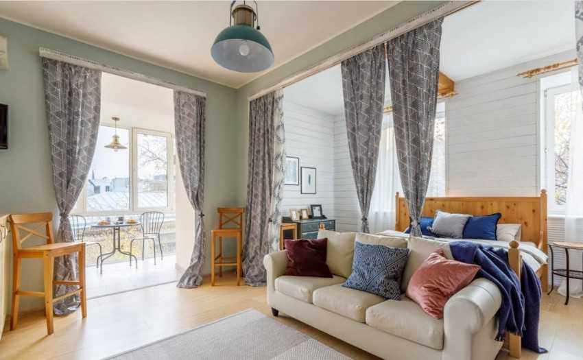 Кровать и зону гостиной разделяют плотными шторами, при этом спальное место располагают около окна.