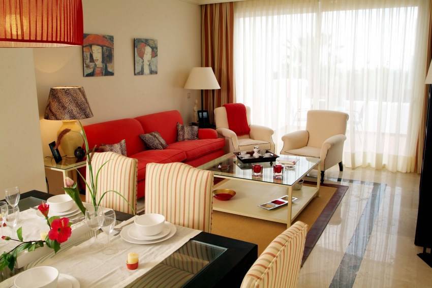 «Кричащие», как и слишком «больнично-белые» расцветки не должны присутствовать в спальне-гостиной.