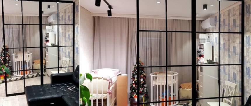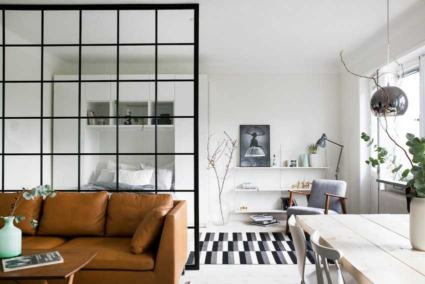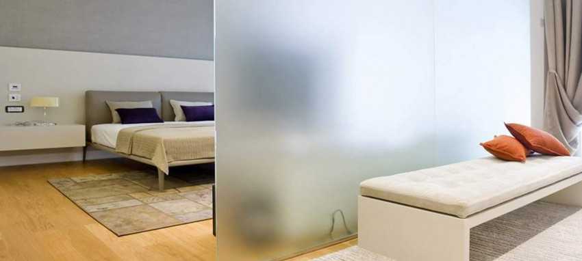 Стекло не блокирует свет, если в разделяемой комнате только 1 окно. Если использовать не прозрачное, а матовое стекло, то можно добиться приватности при разделении комнаты на гостиную и спальню. Обрамлением для стекла может служить дерево или металл. Перегородки со стеклом в металлической раме – современный хит, который прекрасно смотрится не только в лофтовых интерьерах, но и более классических стилях.