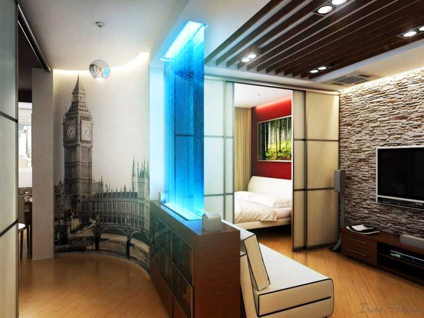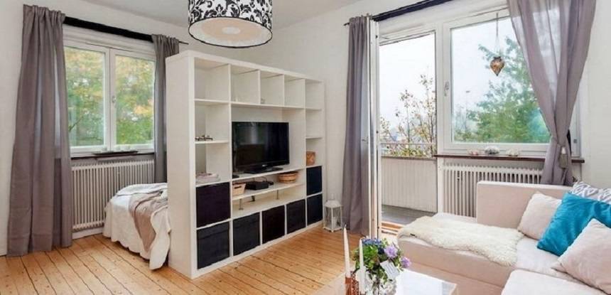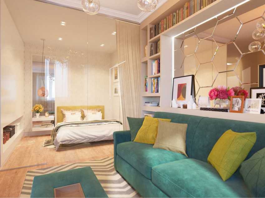 Для варианта разделения жилища на зоны гостиной и спальни подойдет зонирование мебелью. Здесь уместно будет разделение с помощью света и цвета.