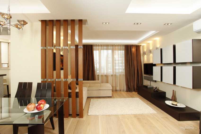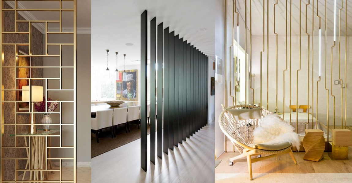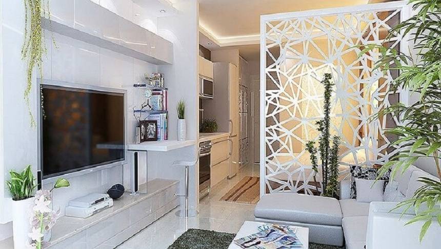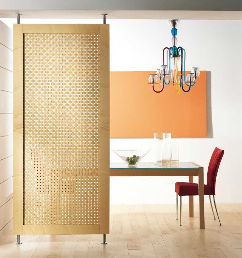 Различные перегородки сейчас на пике популярности. Редкий дизайнерский проект обходится без этого способа зонирования, но уместен он при площади комнаты более 20 кв.м. Разделять более маленькие помещения проблематично, можно получить эффект «коммуналки» с картонными стенами.