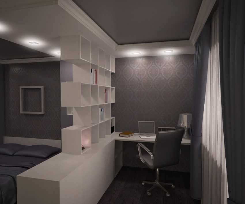 Второй вариант зонирования — совмещение с кабинетом, или рабочей зоной. При таком расположении необходимо оборудовать рабочее пространство рядом с окном.