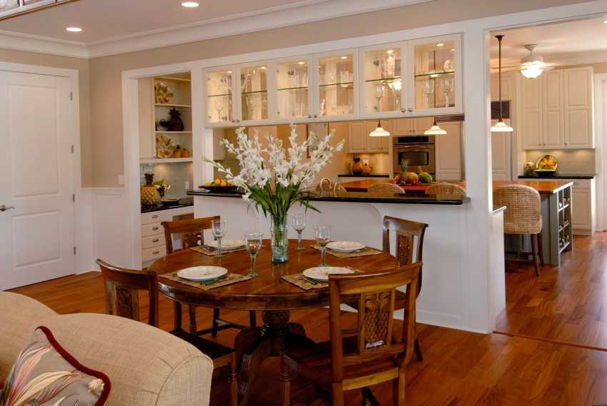 Например, следуя советам экспертов, для правильного зонирования столовой и зоны приема гостей достаточно установить всего две колонны, которые укажут границу между зонами.