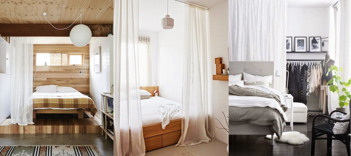 Отделить пространства шторой. Не обязательно вешать плотные тяжелые шторы, они утяжелят интерьер. Выбор остановить лучше на легких занавесках или нитяных шторах. Плюс этот варианта – в возможности трансформации интерьера при закрытых и открытых занавесях. Реализовать способ легко креплением потолочного карниза или натянутой струны.