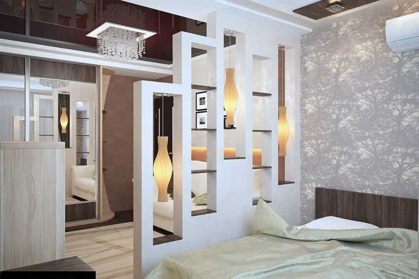 Оригинальное зонирование предоставляют перегородки с нишами, которые можно дополнить светильниками, цветочными горшками, статуэтками и другим декором.